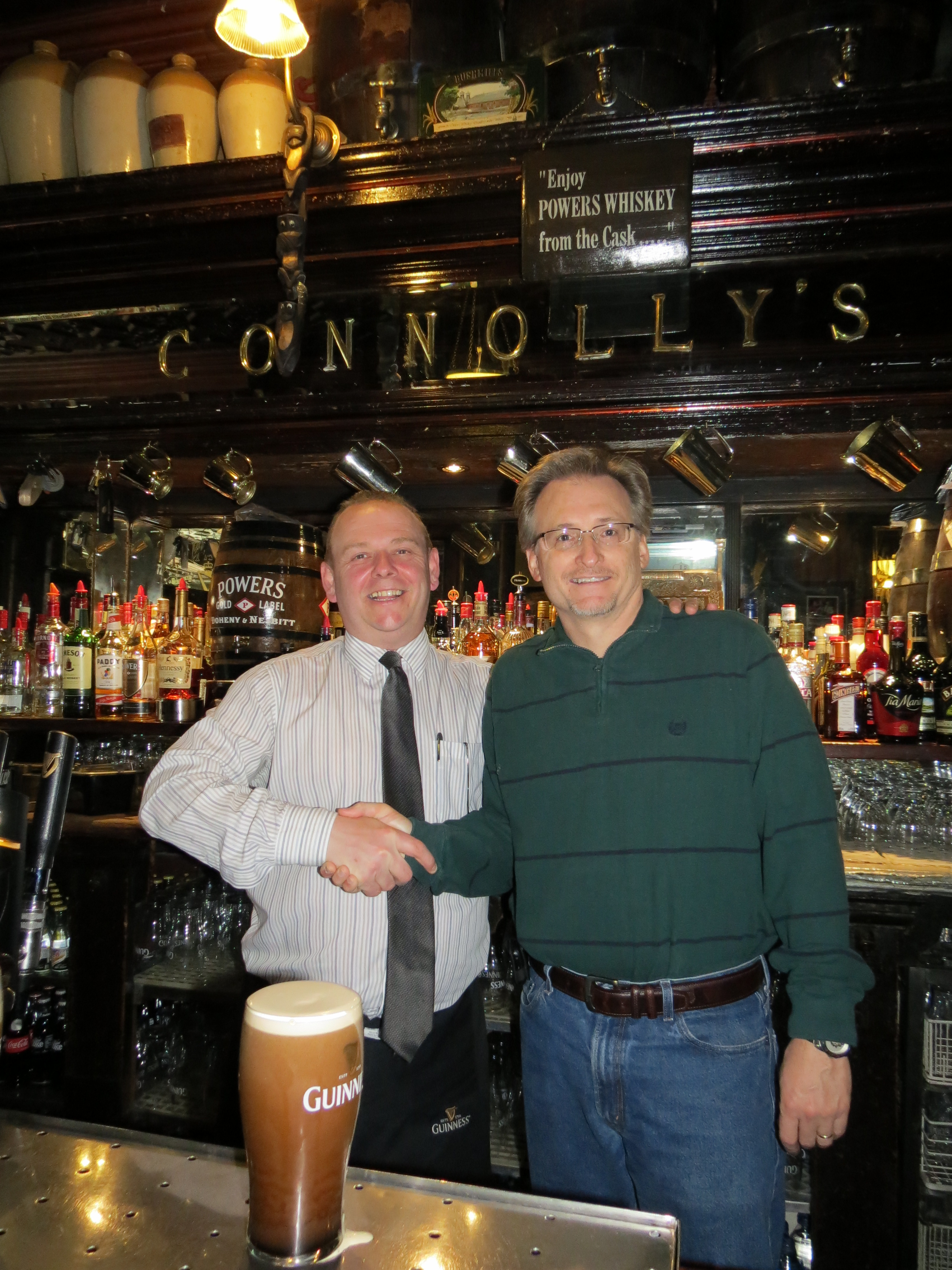 After a big Irish breakfast we hit the town. Prime stops included Trinity College to see the Book of Kells. These illuminated manuscripts of the gospels were created by Irish monks at Iona before the 8th century. We also saw some ancient Christian treasures at the Irish National Museum of Archaeology going back to the roots of Christianity in Ireland. Amazing to see how the Irish Christians incorporated the art of the Celtic pagan peoples into their own. We also took a bus tour of the city and to lighten things up a bit we visited the National Leprechaun Museum. I’ll let my traveling companion tell you more about that. We ended the evening with dinner at Foley’s Pub. The owner Mrs. Foley sent over a little treat to our table. Time to call it a day!